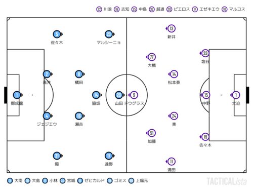 はしがき どうも!今回は川崎戦。広島にとっては苦しかった9連戦の最終戦です。スタメンは以下。 川崎は4-2-3-1。CBの大南、DHの瀬古、WGの遠野が前節から変わってのスタメン。広島は前節同様に満田WBの東DH起用。中2日だが変更はピエロス→ドウグラスのみと…