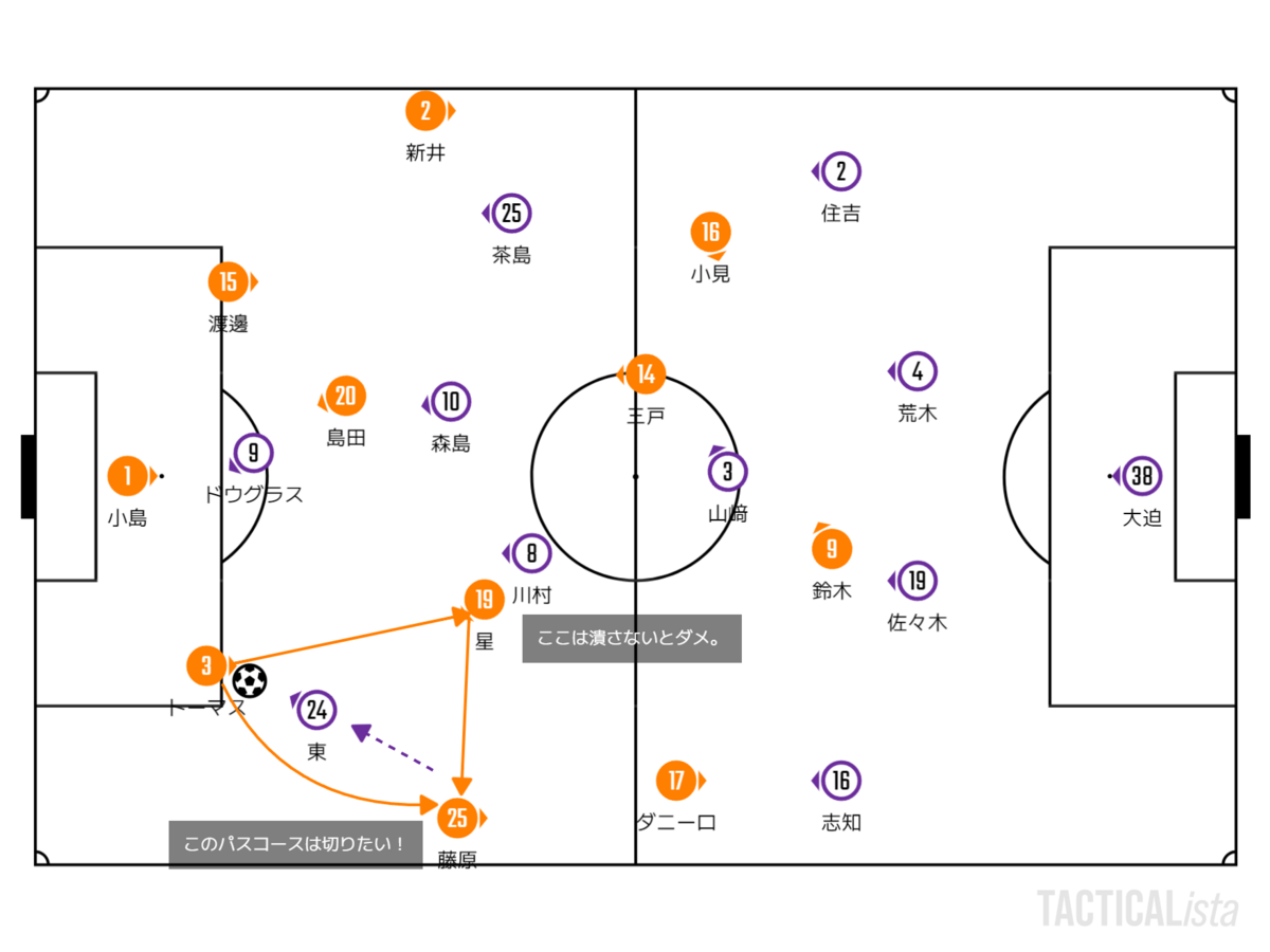 ドウグラスがGKの小島にプレスをかけたところでCBのトーマスに東が出ていきますが、プレスが間に合っておらずSBの藤原に通されたりDHの星を経由して回避されたりしていました。
