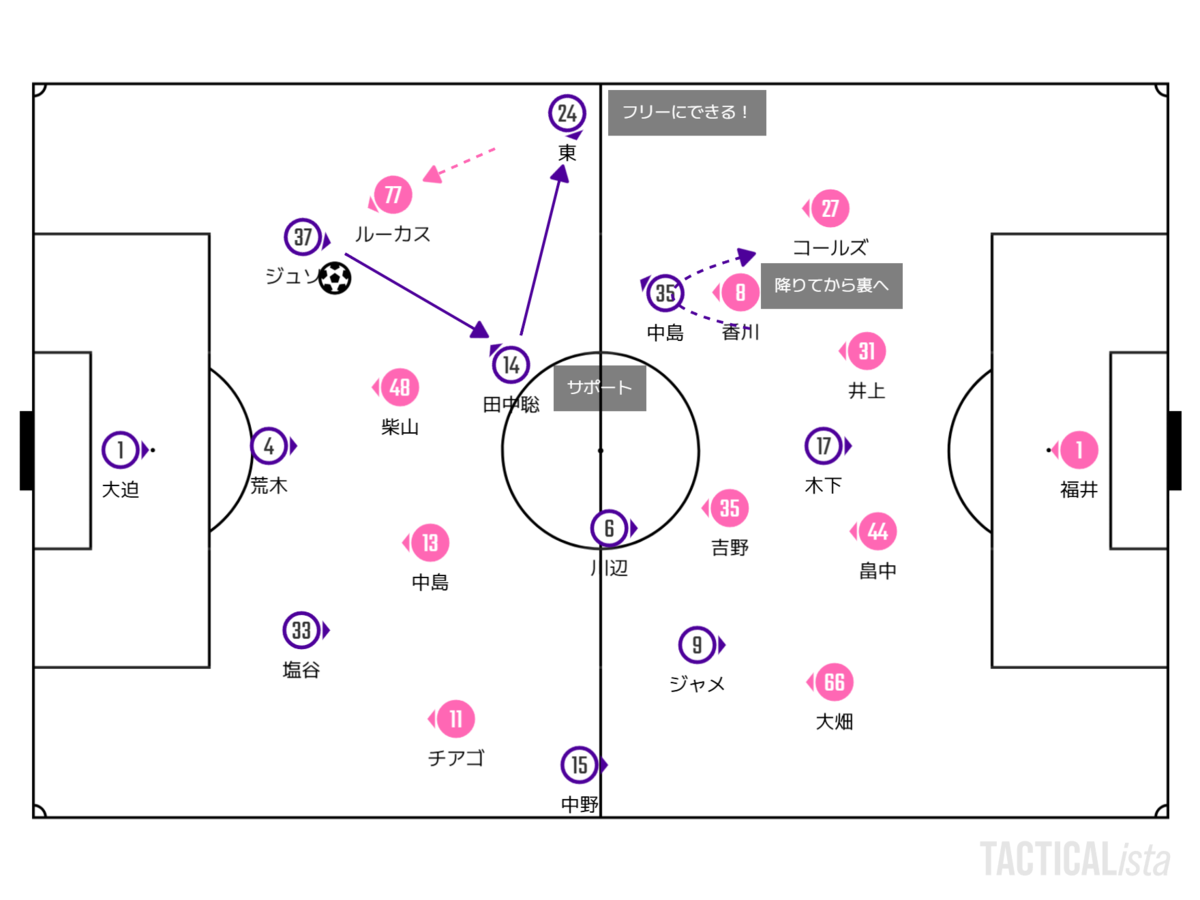 まずWGに縦パスを入れ、それが収まると中央にパスを入れる。この時DHは最終ラインに近い位置、トップ下は裏抜けの動きをすることで田中聡と川辺を引きつけることができるので、そこにDHが上がってきたり中島が降りてきたりすることで起点を作れるという形だ。